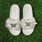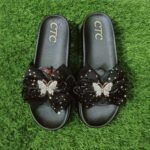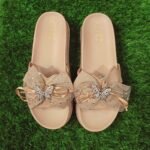 আকর্ষণীয় ফ্ল্যাট স্যান্ডেল, যেখানে সোনালি তারকা প্রিন্টেড বো-এর মাঝখানে রয়েছে ঝকঝকে প্রজাপতি অলংকার। দৈনন্দিন ব্যবহার, পার্টি বা আউটিং – সবক্ষেত্রেই মানানসই
